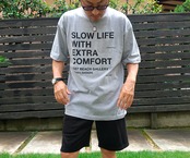 フロントにポリシーのタイポグラフィをシルクスクリーンプリントし、裾にはアクセントに織りネームを配置。